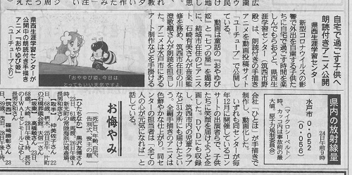 新型コロナウイルスの影響で、外出を自粛する子ども達に、自宅で過ごす時間を楽しんでもらおうと、朗読付き手描きアニメーションをYouTubeで公開している取組を掲載いただきました。